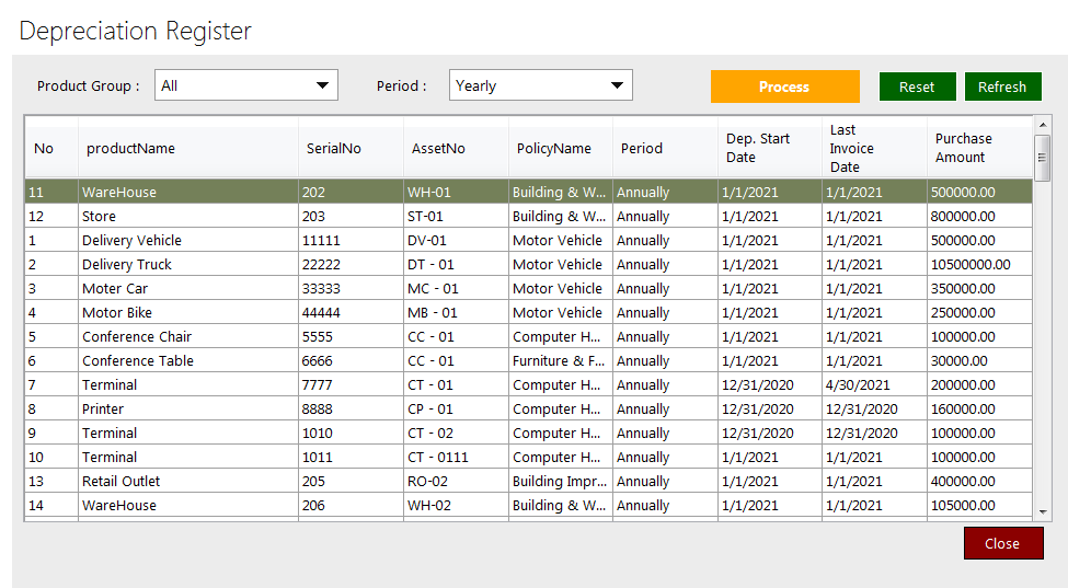 It asks to process for depreciation. The user needs to click on Yes if need to approve the disposal. Once it clicked on yes it directed to the DEPRECIATION REGISTER. Then it needs to click on PROCESS button to run depreciation for the asset. After that it appears as “FIXED ASSET UPDATED SUCCESSFULLY”. Once it approves all, it passes following entries.r